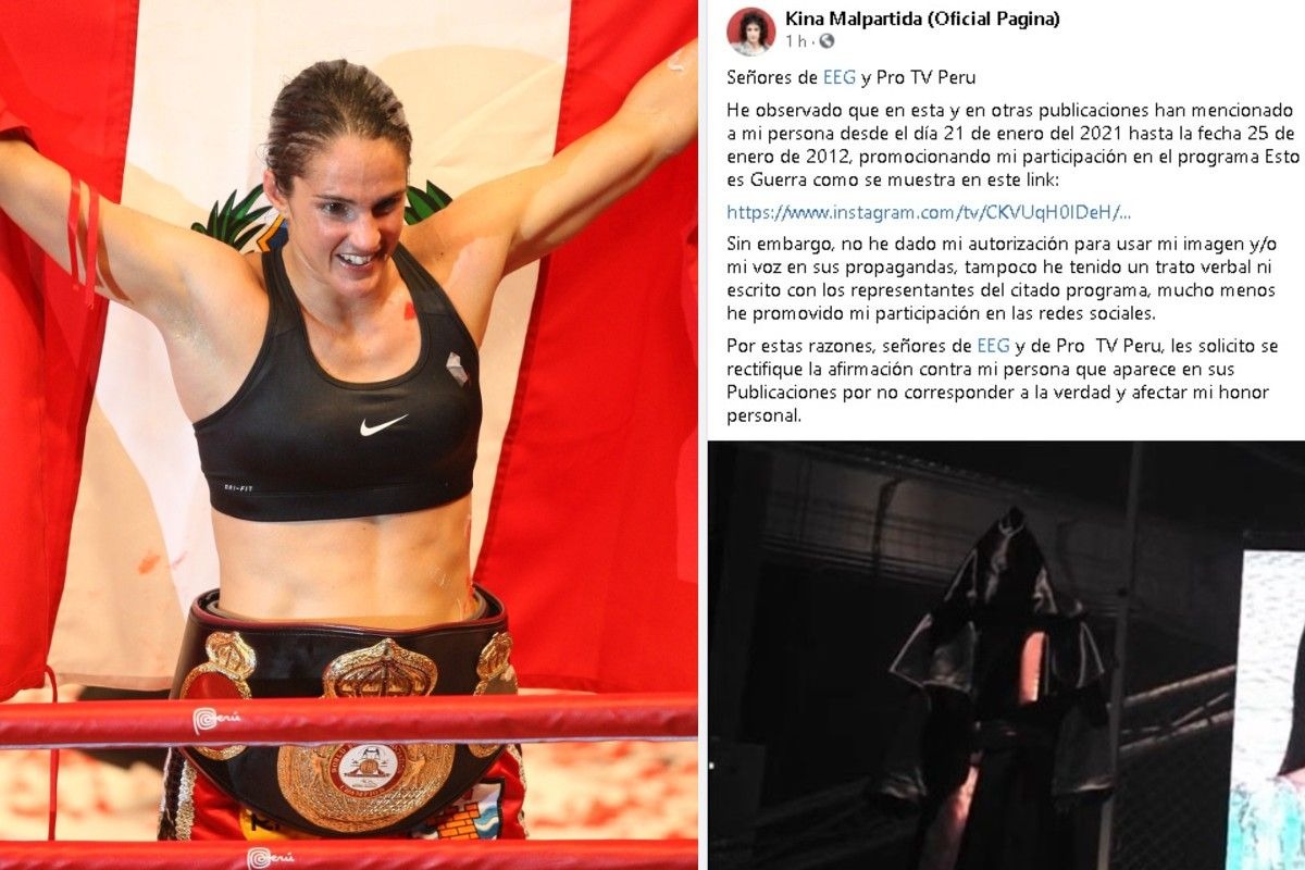 La excampeona mundial de boxeo Kina Malpartida pidió a los productores de Esto es Guerra y Pro TV que retiren su imagen de la promoción del conocido reality de América Televisión. ‘La Dinamita’ utilizó sus redes sociales para pedir que ‘se rectifiquen’ de la publicación, ya que consideró que ‘afectan su honor personal’.