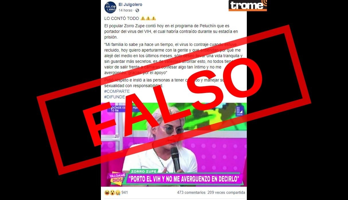 Una página Facebook lanzó una noticia falsa sobre la salud Ricardo Zúñiga, mejor conocido como el Zorro Zupe. "El Julgolero" compartió una información que el mejor amigo de Tilsa Lozano jamás ha dicho en ningún medio.