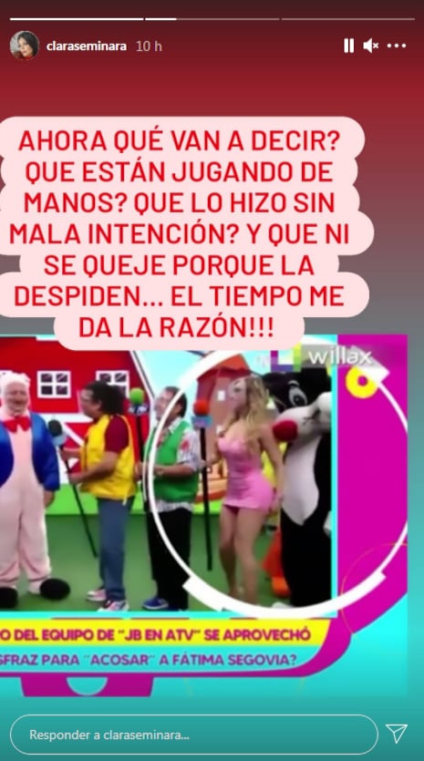La actriz cómica Clara Seminara afirmó que el tiempo le dio la razón, tras conocer la incomodidad que vivió su excompañera ‘La Chuecona’ Fátima Segovia, cuando un muñeco la rozaba durante las grabaciones del programa ‘JB en ATV’. Además, señaló que el imitador Jorge Benavides no es capaz de ponerse de lado de su elenco para solucionar este tipo de hechos.