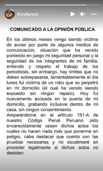 Fiorella Retiz emitió un comunicado donde denuncia que el “acoso de los medios de comunicación” vienen afectando su integridad y la de su familia.
