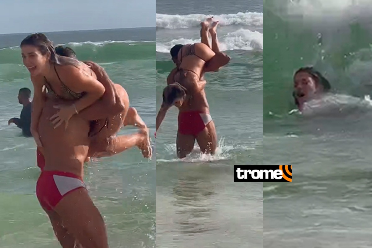 Fue el chico reality de ‘Esto es Guerra’, Fabio Agostini, quien se atrevió a cargarla y hacerle una broma lanzándola al mar y provocando que la ola la revolcara. La modelo ‘ojiverde’ lo tomó con humor, al igual que sus demás acompañantes.