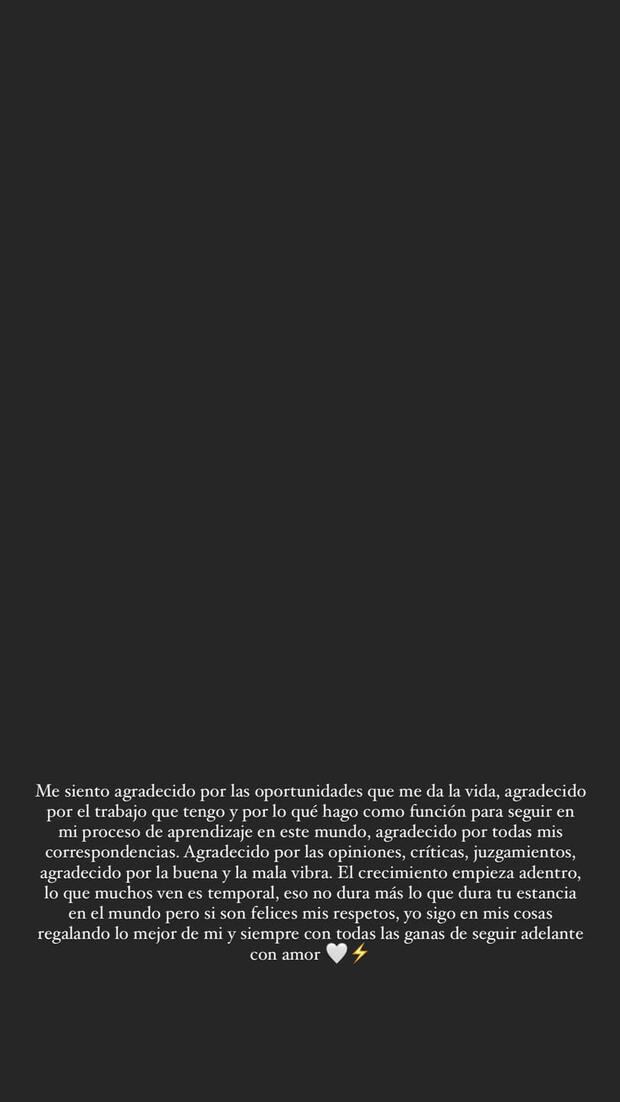 “Me siento agradecido por las oportunidades que me da la vida, agradecida por el trabajo que tengo y por lo que hago como función para seguir en mi proceso en este mundo, agradecido por todas mis correspondencias. Agradecido por las opiniones, críticas, juzgamientos, agradecido por la buena y la mala vibra(...)”, aseguró inicialmente.