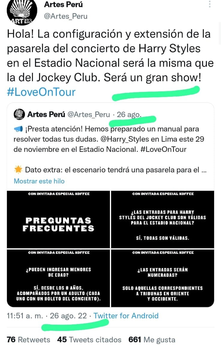 En agosto del 2022, la empresa de eventos anunció el cambió de local y aseguraron que seguiría siendo la misma distribución. “La configuración y extensión de la pasarela del concierto de Harry Styles en el Estadio Nacional será la misma que la del Jockey Club”, comunicaron.