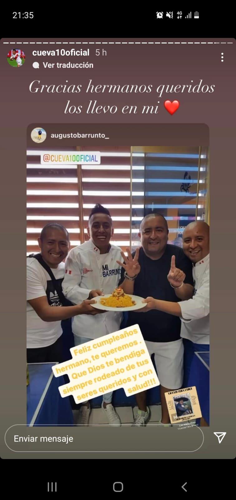 El mediocampista de la selección peruana utilizó sus historias de Instagram para compartir un saludo de la conocida cevichería ‘Mi Barrunto’, que se encuentra en el distrito de La Victoria y donde acuden muchos futbolistas.
