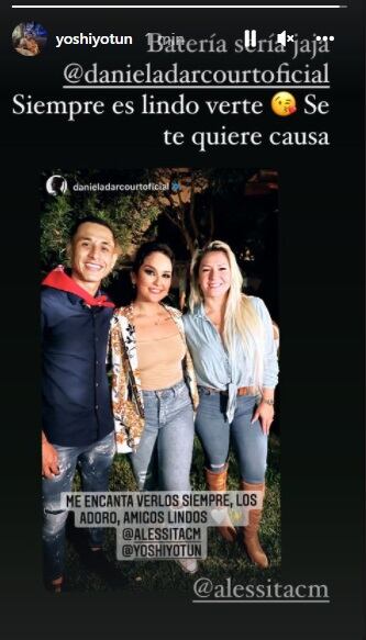 ‘Yoshi’ se tomó una foto con su esposa y la salsera en la reunión del ‘Depredador’. Luego, Darcourt publicó la imagen en sus historias de Instagram, haciendo mención al futbolista y su pareja. “Me encanta verlos siempre, los adoro, amigos lindos”, escribió.