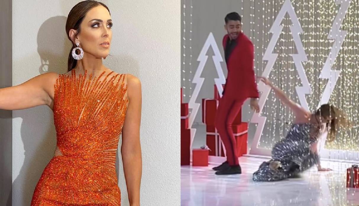 En las imágenes se puede ver a la actriz junto al presentador Carlos Adyan grabando un promocional de Navidad para la cadena de Telemundo, cuando tras dar unos coordinados pasos de baile, algunas vueltas, terminó enredándose con su vestido y tacones, cayendo al piso sin poder sostenerse.