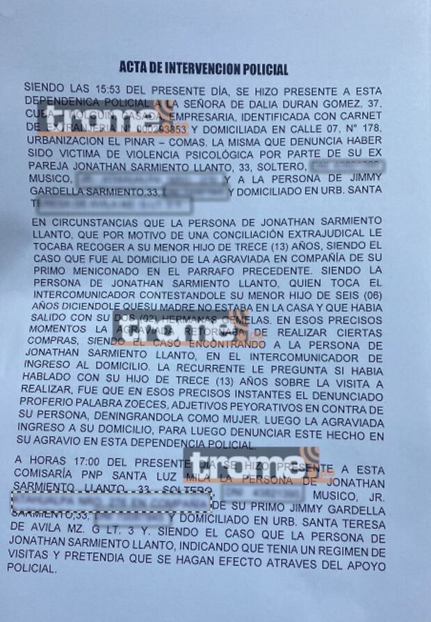 “Asimismo, estando presente el primo de Johnatan Sarmiento, Jimmy Gardella Sarmiento, quien de la misma manera comenzó a burlarse de Dalia Durán, mofándose mediante sonrisas y comenzó a grabar hechos que fueron en presencia de sus menores hijos, quienes al notar las agresiones piscológicas comenzaron a llorar”