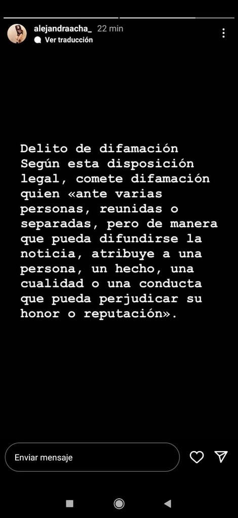 Alejandra Acha publicó lo siguiente: “Delito de difamación. Según esta disposición legal, comete difamación quien “ante varias personas, reunidas o separadas, pero de manera que puede difundirse, la noticia, atribuye a una persona, un hecho, una cualidad o una conducta que puede perjudicar su honor o reputación”.