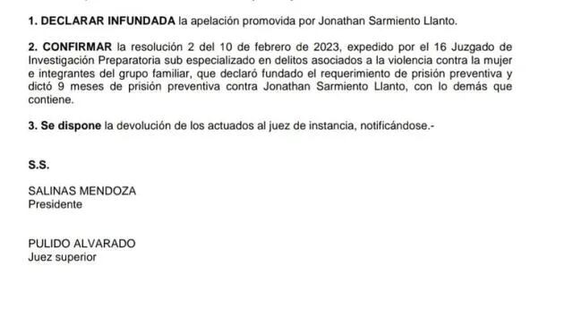 La apelación presentada por Jonathan Sarmiento Llanto, también conocido como John Kelvin, para revocar la prisión preventiva que se le impuso por agredir a Dalia Durán, ha sido rechazada por mayoría en el Poder Judicial.