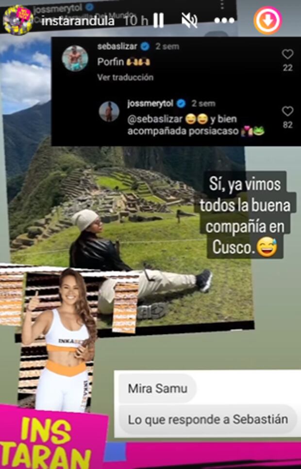 En una imagen en Machu Picchu, el fisicoculturista Sebastián Lizarzaburu comenta su fotografía y ella no duda en replicarle para presumir a su acompañante. “Y bien acompaña, por si acaso”, escribió.