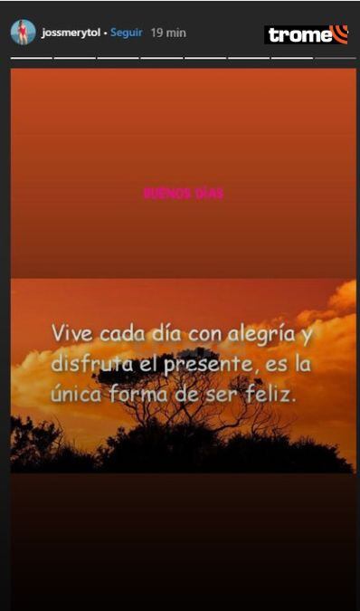 “Vive cada día con alegría y disfruta el presente, es la única forma de ser feliz”, dice el mensaje que Jossmery Toledo compartió en su cuenta de Instagram tras la publicación del ampay con el jugador.