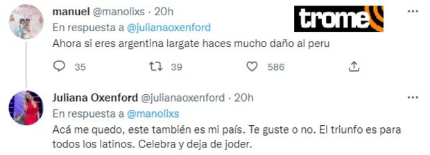 “Ahora sí eres argentina, lárgate, haces mucho daño al Perú”, escribió un usuario en Twitter en respuesta a la foto de la comunicadora con la camiseta de Argentina. Juliana Oxenford, nacionalizada peruana, respondió.
