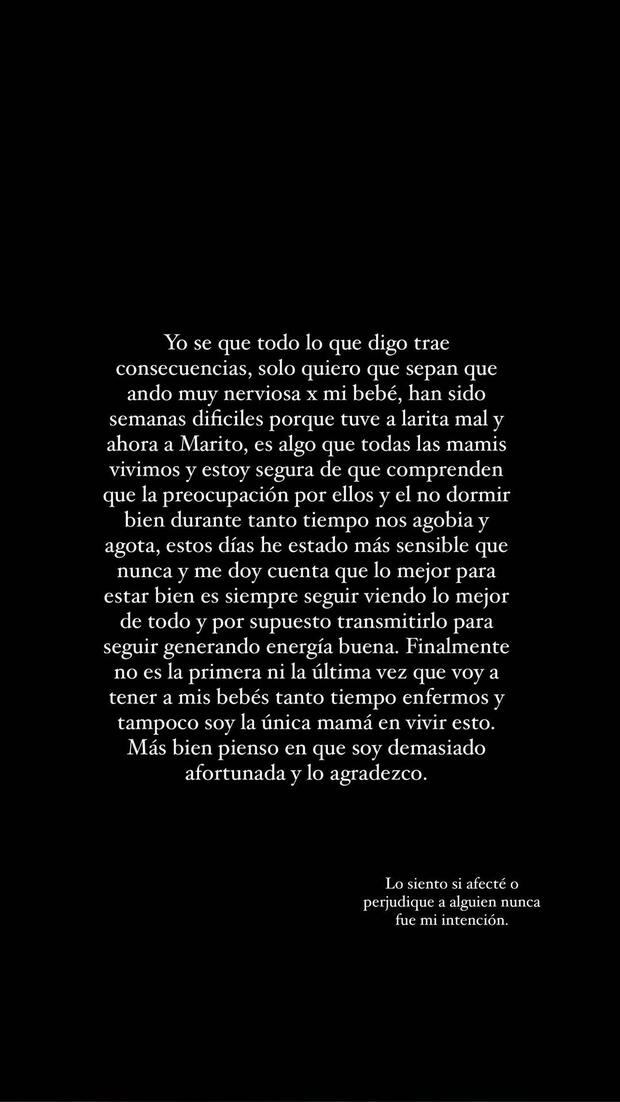 “Yo sé que todo lo que digo trae consecuencias, solo quiero que sepan que ando muy nerviosa por mi bebé, han sido semanas difíciles porque tuve a Larita mal y ahora a Marito (...) Lo siento si afecté o perjudiqué a alguien, nunca fue mi intención”.”, expresó en su cuenta de Instagram.