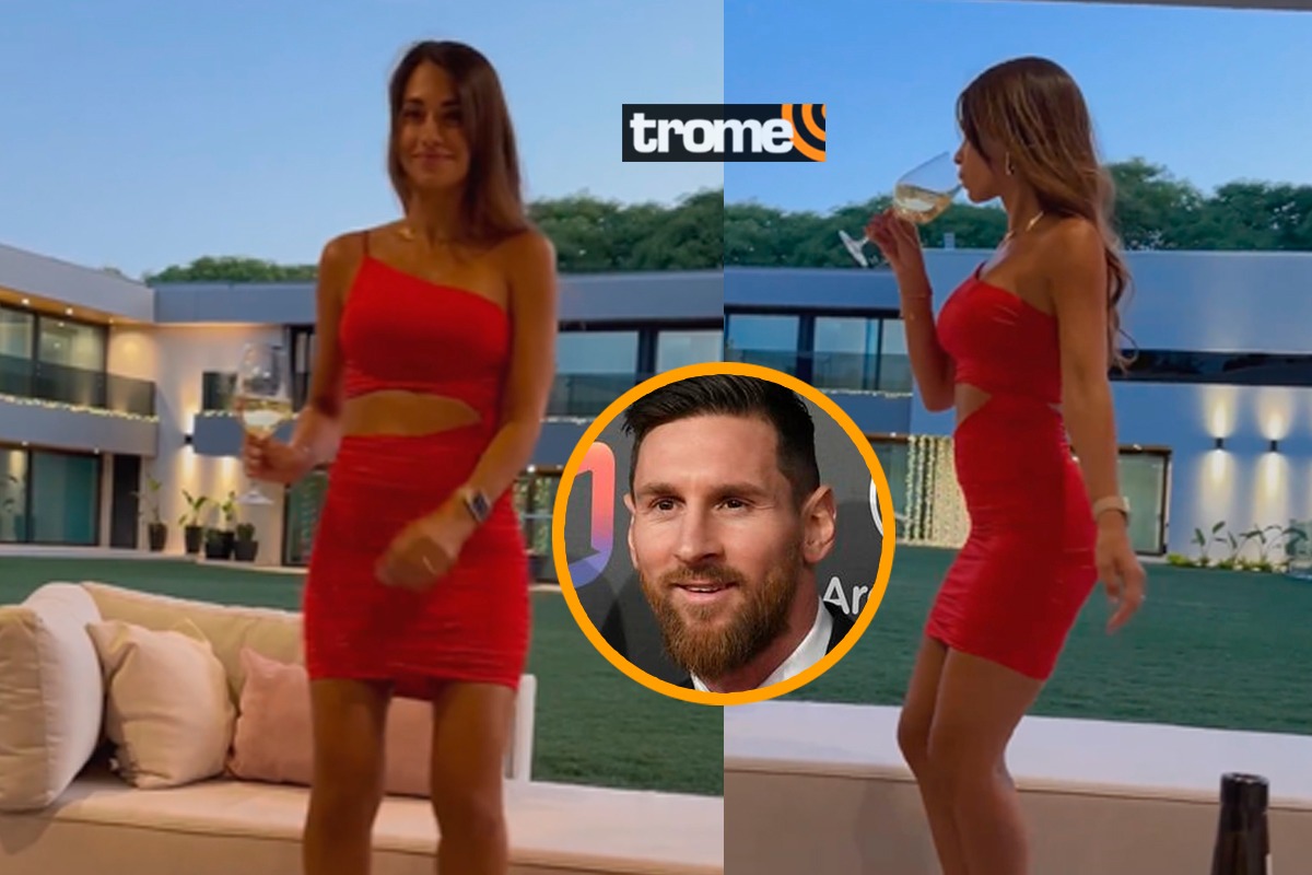 El mejor futbolista del mundo grabó a su pareja mientras tomaba una copa de champagne y bailaba una conocida cumbia argentina. Rocuzzo muestra sus dotes para el baile luciendo un ceñido vestido rojo.
