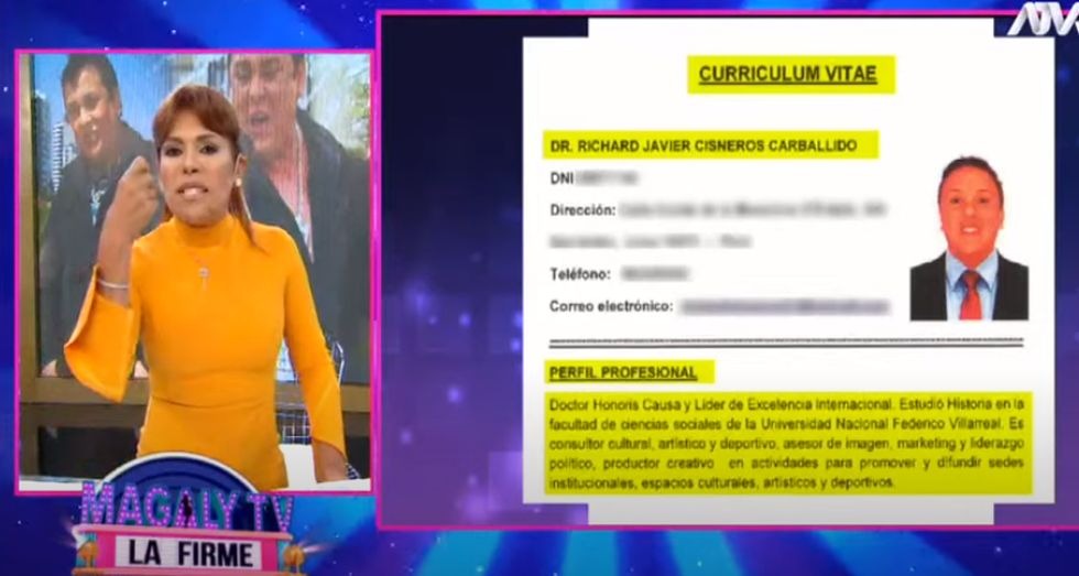Luego, Magaly Medina lleyó su CV, donde asegura ser Doctor Honoris Causa y Líder de Excelencia Internacional. “Estudió Historia en la facultad de ciencias sociales de Villareal. Es consultor cultural, artístico y deportivo, asesor de imagen, marketing y liderazgo político, productor creativo en actividades para promover y difundir sedes institucionales, espacios culturales, artísticos y deportivos”, dice el documento.
