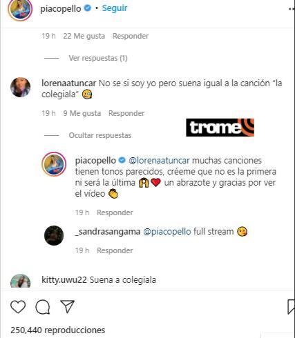 “Muchas canciones tienen tonos parecidos, créeme que no es la primera ni será la última 🙌❤️ un abrazote y gracias por ver el vídeo 👏”, le respondió, de manera tajante, María Pía Copello a una seguidora.