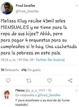 Ante esto, usuarios en Twitter, Facebook e Instagram calificaron de “abusiva” a Melissa Klug: “Te pasaste de fresca y sangrona”, “Pidiendo ayuda al Ministerio de la Mujer cuando hay padres que pasan 300 soles mensuales y otros ni un sol”, “gana más que un congresista y también sin hacer nada”, entre otros comentarios.