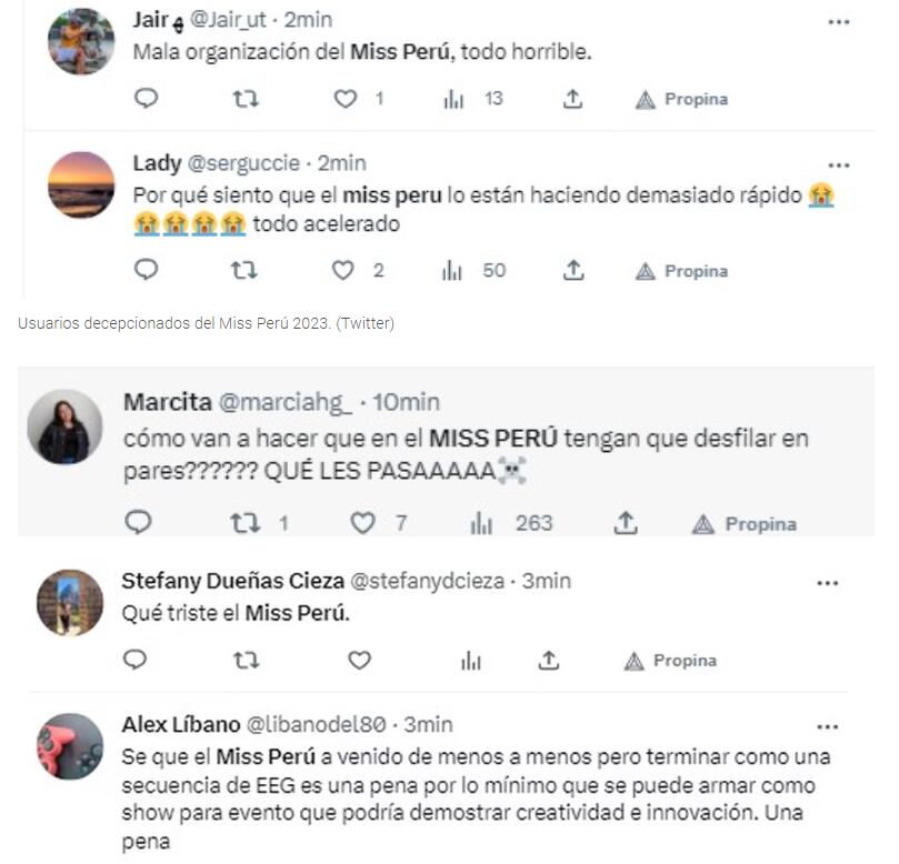 Mala organización del Miss Perú, todo horrible”, “¿Están apurados?“Esa pasarela del Miss Perú duró menos que Meche Araoz como presidenta”, ¿Por qué está yendo tan rápido el certamen?”.
