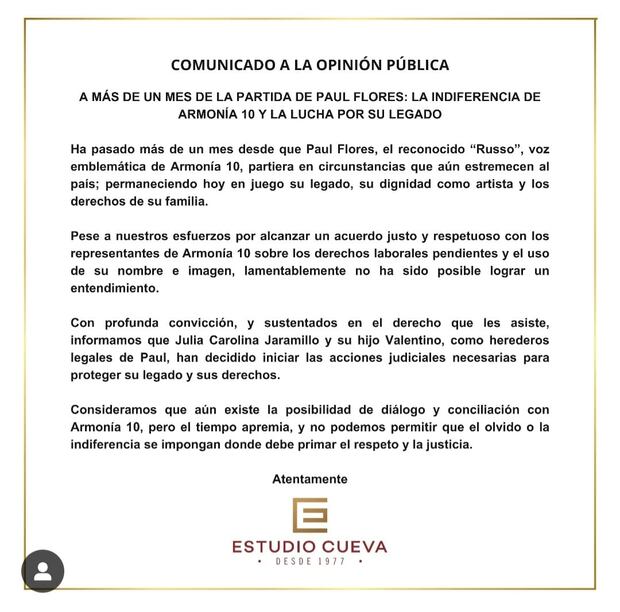 En ese sentido anunciaron que Carolina Jaramillo y su hijo Valentino, herederos legales de Paul Flores, decidieron tomar las acciones judiciales necesarias para proteger el legado y derechos de Russo.