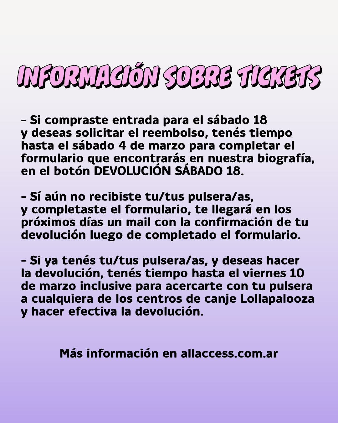 Además, la organización de Lollapalooza Argentina brindó información a los usuarios que quisieran el reembolso de sus entradas ante la cancelación de la presentación de Blink 182.