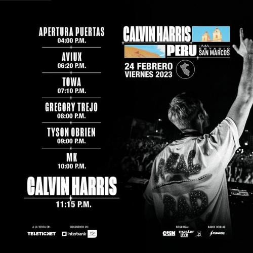 Calvin Harris se presentará en el Estadio de San Marcos, en un evento en el que se realizará la apertura de las puertas desde las 4 p.m. En total, habrán cinco DJs que serán teloneros y recién a las 11:15 p.m. saldrá el DJ escocés. Revisa todos los horarios del evento a continuación: