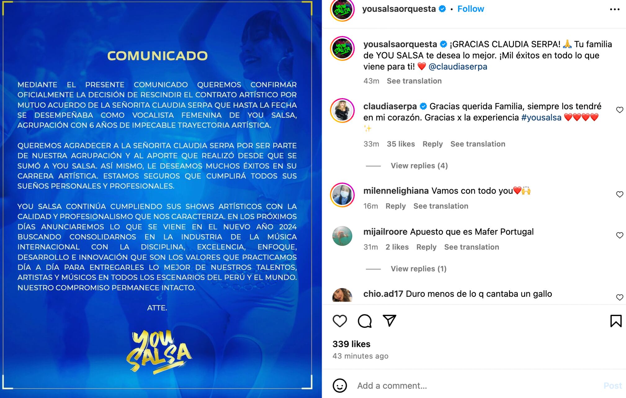 Tras hacerse pública su salida, Claudia Serpa agradeció a You Salsa por la experiencia y el tiempo. “Gracias querida Familia, siempre los tendré en mi corazón. Gracias por la experiencia”, dijo.
