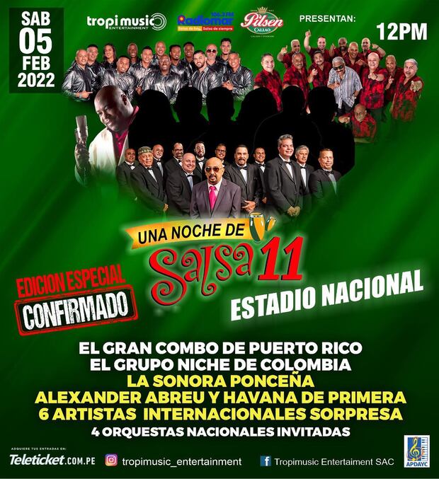 El evento más importante de la escena salsera en el Perú regresa con “Una noche de salsa 11, edición especial’, este 05 de febrero del 2022 en el Estadio Nacional, con El Gran Combo de Puerto Rico, El grupo Niche de Colombia, La Sonora Matancera, entre otros grupos extranjeros sorpresa; y 4 orquestas nacionales.