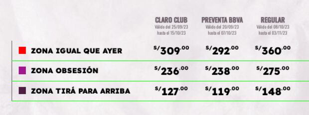 Cabe señalar que la venta de los boletos inició este 22 de septiembre con un 20% de descuento con tarjeta BBVA hasta el 7 de octubre a través de Teleticket. A continuación, revisa los precios de las entradas -que oscilan entre los S/ 148 y S/ 360 a precio regular-.
