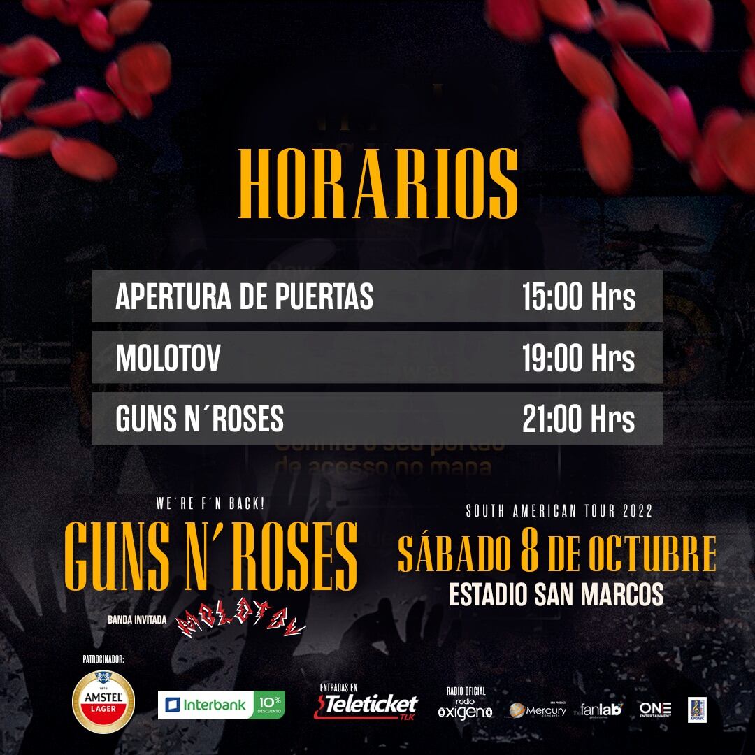 Los fanáticos que acudan al Estadio de San Marcos ya conocen los horarios que tendrá el evento musical: las puertas se abrirán desde las 3 p.m., por lo cual se recomienda ir con anticipación ante la alta cantidad de gente que acudirá. Después, Molotov iniciará su show a las 7 p.m., mientras que Guns N’ Roses hará lo propio desde las 9 p.m.