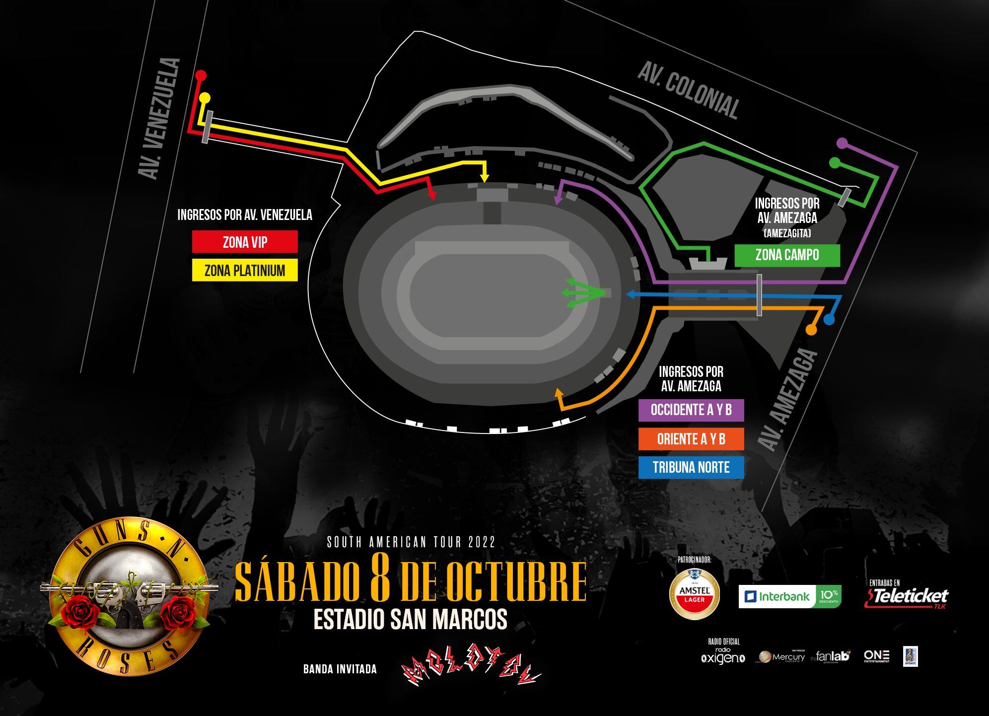 One Entertainment, productora del concierto de Guns N’ Roses, compartió cuáles serán los accesos al Estadio de San Marcos según las diferentes zonas que hay: