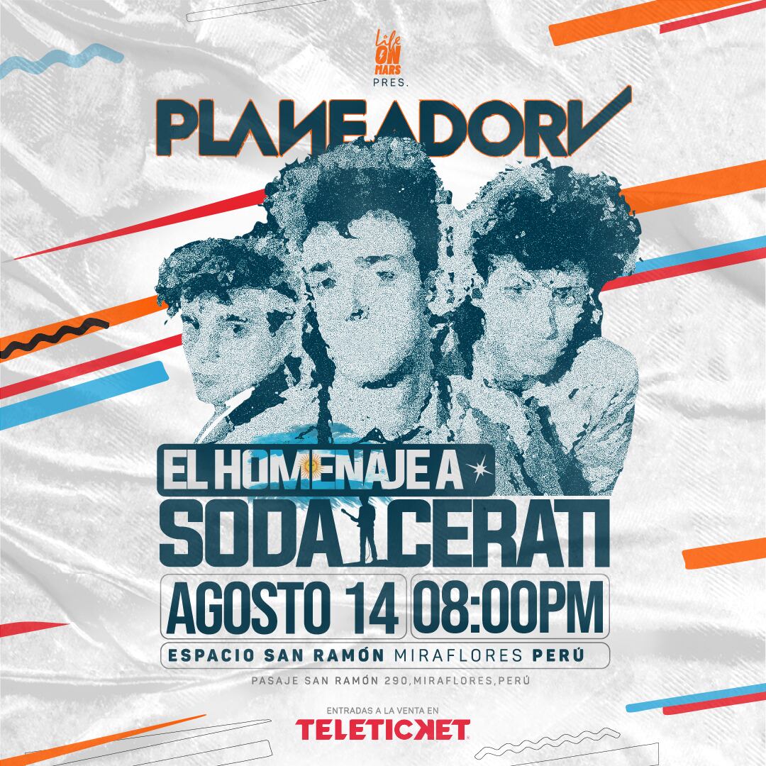 Su esperado show en Lima, el 14 de agosto en Espacio San Ramón (Pasaje San Ramón 290, Miraflores), será la oportunidad perfecta para que los fans de Soda Stereo y Cerati puedan escuchar y cantar las canciones más emblemáticas de la agrupación que se ha convertido en toda una leyenda del rock en español.