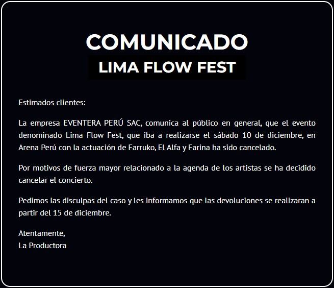 Cabe señalar que el “Lima Flow Fest” inicialmente se iba a realizar el pasado 21 de octubre, sin embargo, la organización comunicó el cambio de fecha al 10 de diciembre debido a imprevistos logísticos.