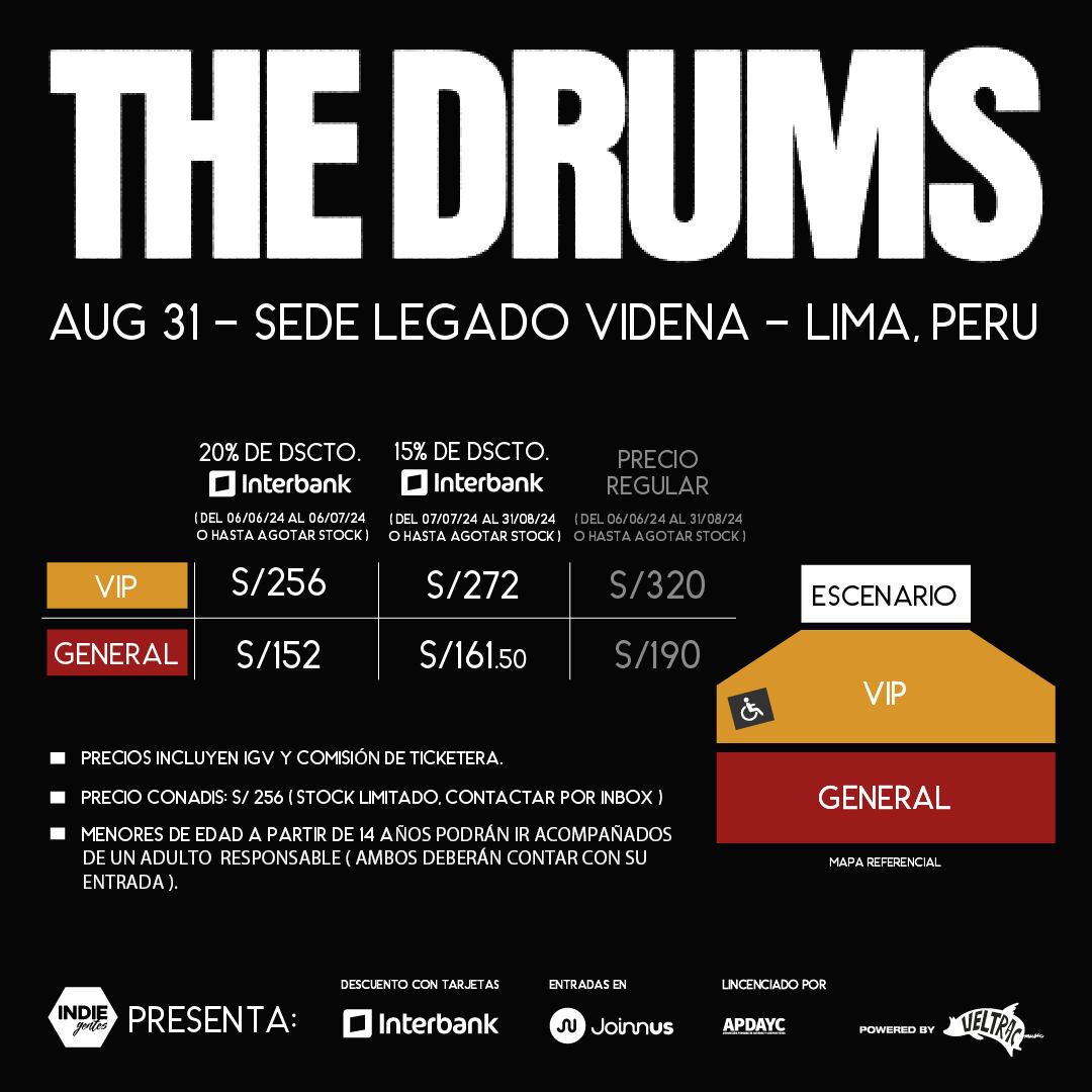 Las entradas para ir al show de The Drums ya están disponibles en la plataforma de Joinnus. Pueden ingresar menores de 14 años acompañados de un adulto responsable para el ingreso del evento. Todas las personas para ingresar deben contar con una entrada. Aplican descuentos con tarjetas Interbank.