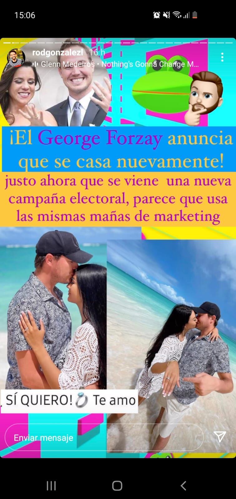 “¡El George Forsyth anuncia que se casa nuevamente! Justo ahora que se viene una nueva campaña electoral, parece que usa las mismas mañas de marketing”, escribió Gonzaléz.