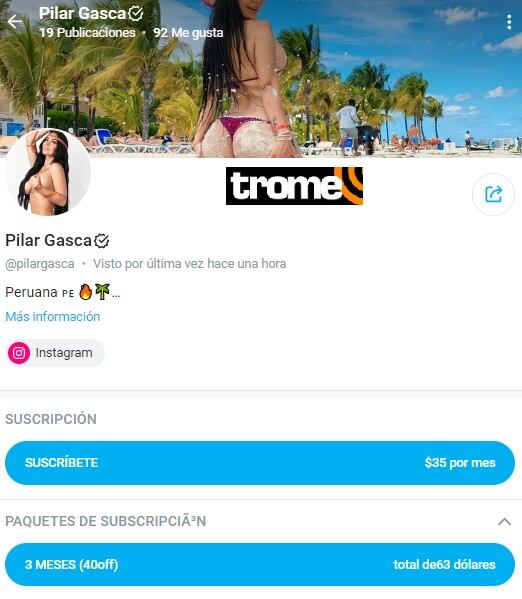 Según la plataforma de OnlyFans, Pilar Gasca es una de las más exitosas peruanas en la web de contenido sexual y es que la pareja de Edwin Sierra cobra 35 dólares al mes y ofrece un paquete por tres meses de tan solo 63 dólares.