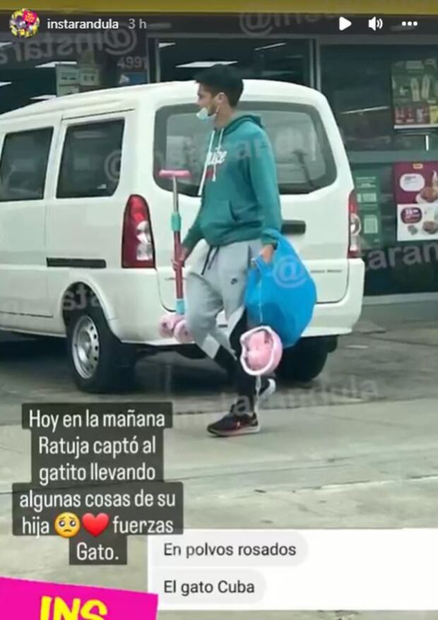 “Hoy en la mañana Ratuja capó al Gatito llevando algunas cosas de su hija. Fuerzas Gato”, escribió el popular ‘Samu’ en sus historias. Además, explicó que el futoblista estaba en Polvos Rosados al momento de ser captado por su seguidora.
