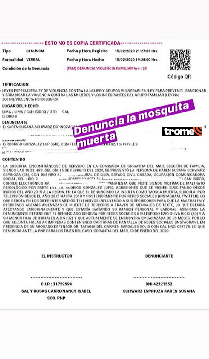 Karen Schwarz manifestó que viene siendo víctima de maltrato psicológico por parte de Rodrigo González desde inicios del 2015 hasta la fecha. La conductora señala, además, que la insulta con calificativos como ‘mosca muerta’ y 'ridícula’ por TV y redes sociales. Asimismo la denuncia señala que ‘Peluchín’ denigra por redes sociales a su esposo y a su menor hija de dos años.