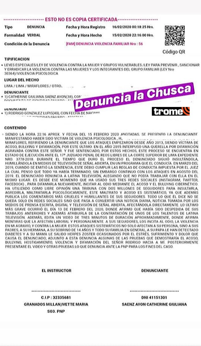 Cathy Sáenz señaló que Rodrigo González ha usado sus redes sociales para incitar al odio en su contra mediante el acoso. “Ha usado una tribuna de dos millones de seguidores” para insultarla, agredirla y maltratarla psicológicamente. Además, la conductora asegura que los comentarios de 'Peluchín’ afectan a toda su familia. A su padre le han detectado diabetes y a su mamá, Herpes Zoster ocasionados por el estrés , sufrimiento y dolor que causa el denunciado.
