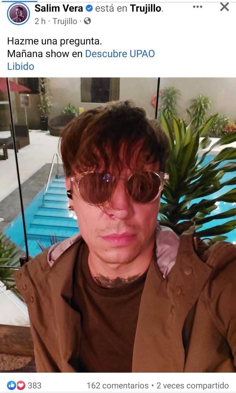 Ahora, Salim Vera se animó a contar un poco más de lo sucedido entre Andrea Llosa y él. El cantante colocó una foto desde la ciudad de la eterna primavera Trujillo y al pie de esta colocó: “Hazme una pregunta. Mañana show en Descubre UPAO. Líbido”.