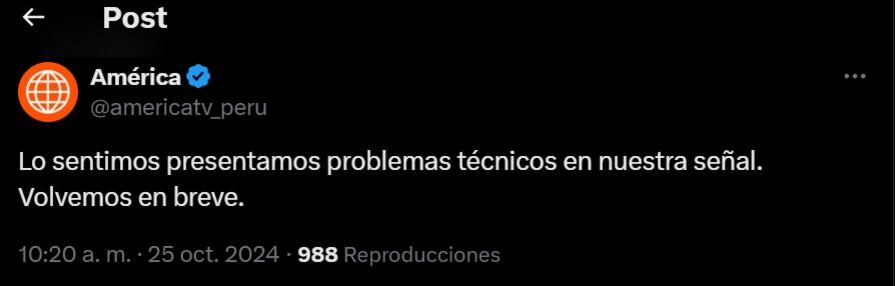 Ambos canales se pronunciaron a través de sus redes sociales para explicar los motivos de la falta de señal. “Lo sentimos, presentamos problemas técnicos en nuestra señal. Volvemos en breve”, se lee en la cuenta de X de América.