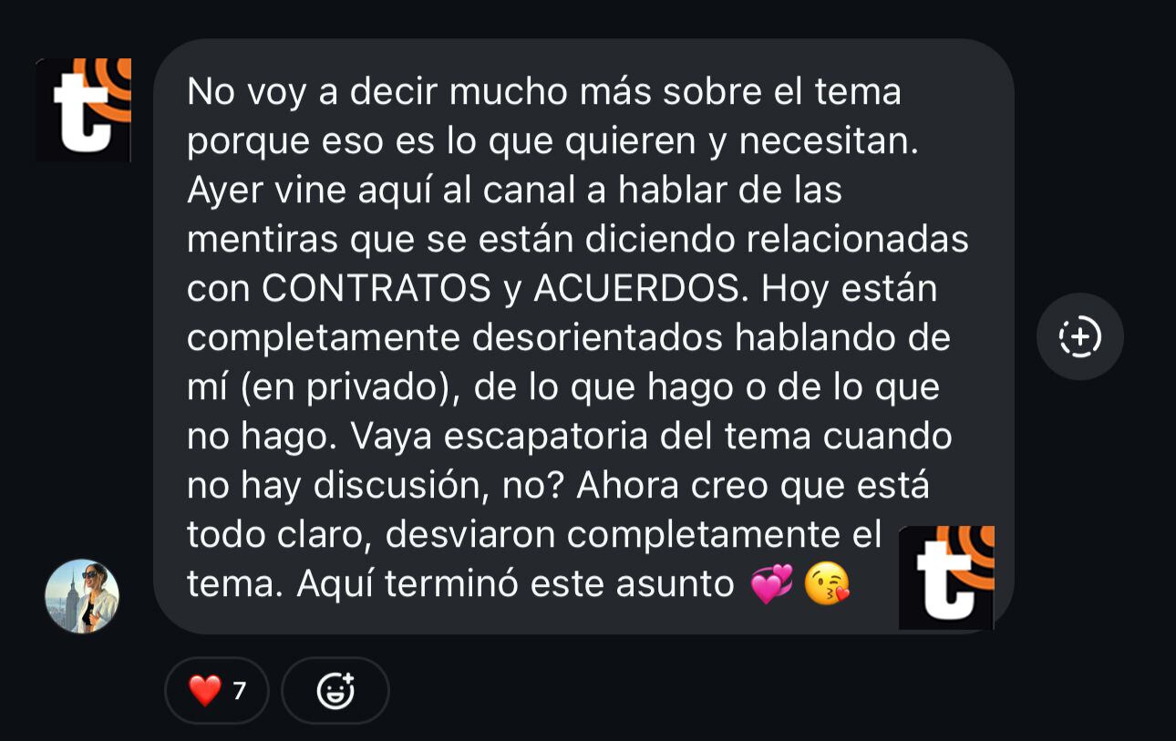 “No voy a decir mucho más sobre el tema porque eso es lo que quieren y necesitan. Ayer vine aquí al canal a hablar de las mentiras que se están diciendo relacionadas con contratos y acuerdos. Hoy están completamente desorientados hablando de mí (en privado), de lo que hago o de lo que no hago. Vaya escapatoria del tema cuando no hay discusión, ¿no? Ahora creo que está todo claro, desviaron completamente el tema. Aquí terminó este asunto”.