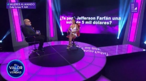 Angie Jibaja en 'El Valor de la Verdad' confesó que tuvo una noche con Jefferson Farfán. Según la 'chinita', el futbolista habría pagado por una suite de 5 mil dólares en un lujoso hotel donde "no pasó nada" y "solo nos dimos unos besitos tiernos", porque en realidad "no me gusta ser mujer de una sola noche".