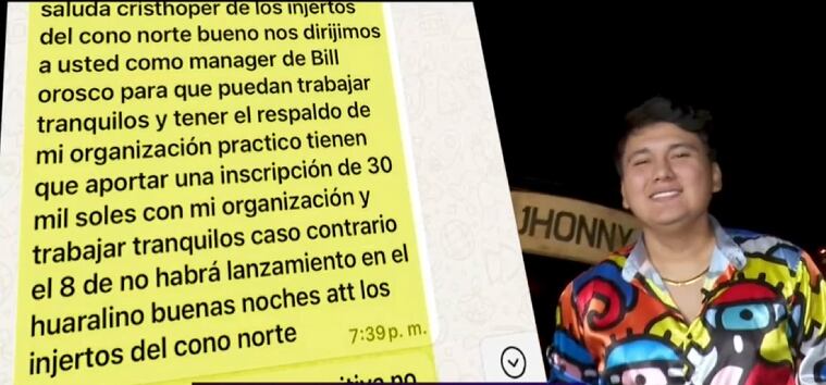 “Nos dirigimos a usted como manager de Bill Orosco para que puedan trabajar tranquilos y tener el respaldo de mi organización. Tienen que aportar una inscripción de 30 mil soles. Caso contrario, el 8 no habrá lanzamiento en el Huaralino. Buenas noches, atentamente los ‘Injertos del Cono Norte’”, se lee en el mensaje enviado al representante del primo de Deyvis Orosco.