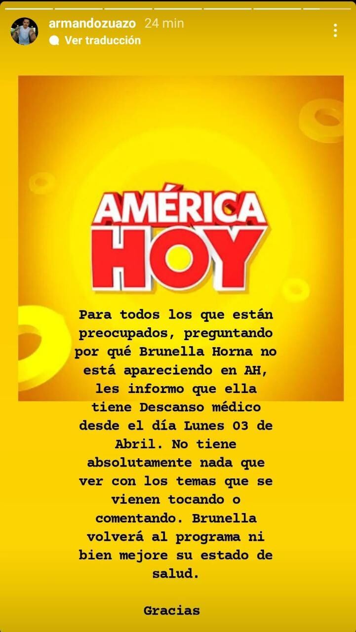 “Para todos los que están preocupados, preguntando por qué Brunella Horna no está apareciendo en AH, les informo que ella tiene descanso médico desde el día lunes 03 de abril”, se lee en la primera parte del anuncio.
