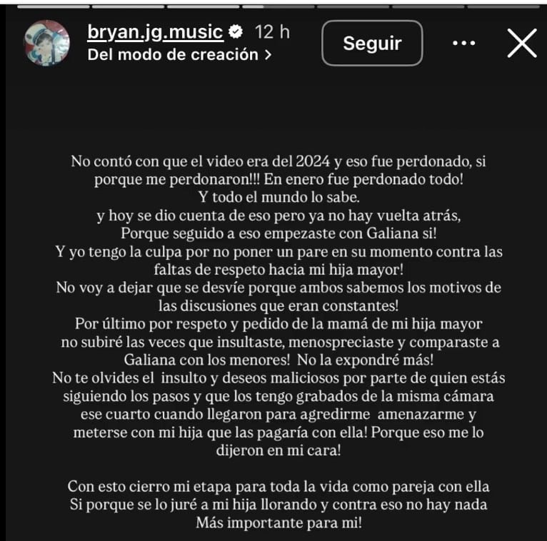 “Yo tengo la culpa por no poner un pare en su momento contra las faltas de respeto hacia mi hija mayor. No voy a dejar que se desvíe porque ambos sabemos los motivos de las discusiones que eran constantes. No compartiré las veces que insultaste, menospreciaste y comparaste a Galiana (su hija mayor) con los menores”, relató Bryan.