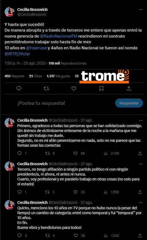 Cecilia Brozovich ha decidido hacer públicas sus opiniones en las redes sociales, específicamente en su cuenta de Twitter. En un hilo de mensajes publicado el 25 de agosto, expresó sus sentimientos tras enterarse de su despido de manera abrupta y a través de intermediarios.