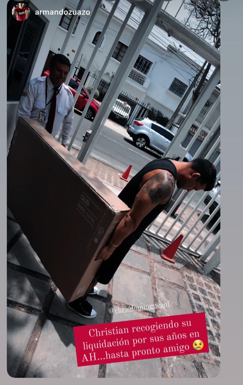 En una historia publicada por el popular ‘Papá Armando’, se ve una fotografía en donde Christian está cabizbajo llevándose un televisor, con el siguiente título: “Christian recogiendo su liquidación por sus años en AH… hasta pronto amigo”.