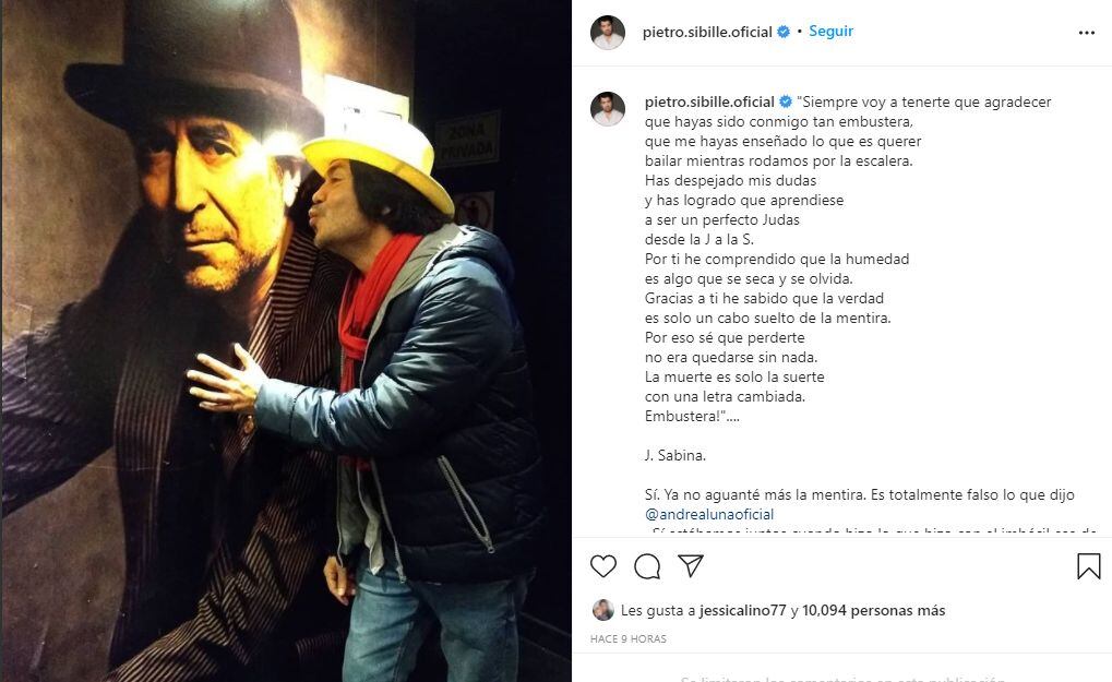 “Me desperté con la noticia de que Pietro Sibille (que seguro está borracho y maltratando a alguien) dijo que yo supuestamente le fui ‘infiel’ Esto es completamente FALSO! Estuve tratando de salir de esta relación tóxica por años en donde fui maltratada física y psicológicamente... Fui chantajeada para seguir una relación que no tenía pies ni cabeza, en donde este señor me decía que si no seguía con él se suicidaría”, aseguró Luna. Cabe señalar que tras el post de la actriz, Pietro eliminó su mensaje en Instagram.
