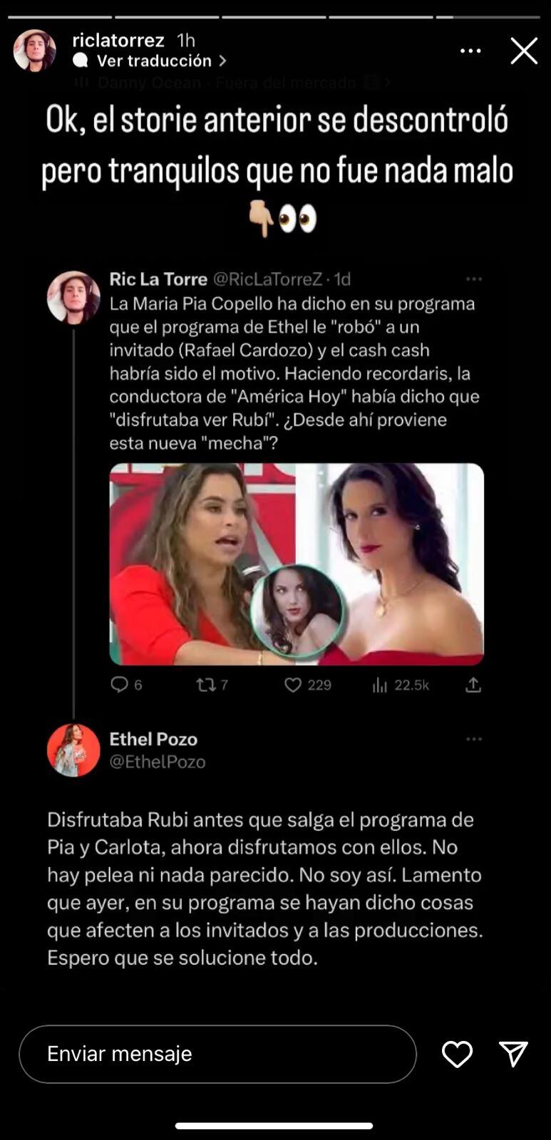 “No soy así, lamento que ayer en su programa se hayan dicho cosas que afecten a los invitados y a las producciones. Espero que se solucione todo”.