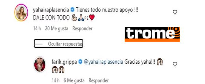 Es así que el cantante recibió distintas muestras de apoyo y una de ella llegó de parte de Yahaira Plasencia a través de un mensaje de Instagram; el cual decía: ¡“Tienes todo nuestro apoyo! DALE CON TODO”, a lo que Grippa respondió: “Gracias Yaha”.